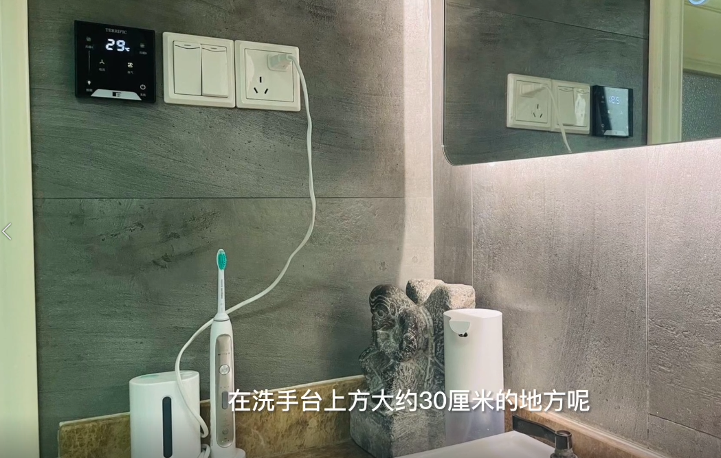 卫生间洗手台上方约30cm处,可以按需布置插座,方便给电动牙刷、剃须刀、吹风机等常用小电器供电。