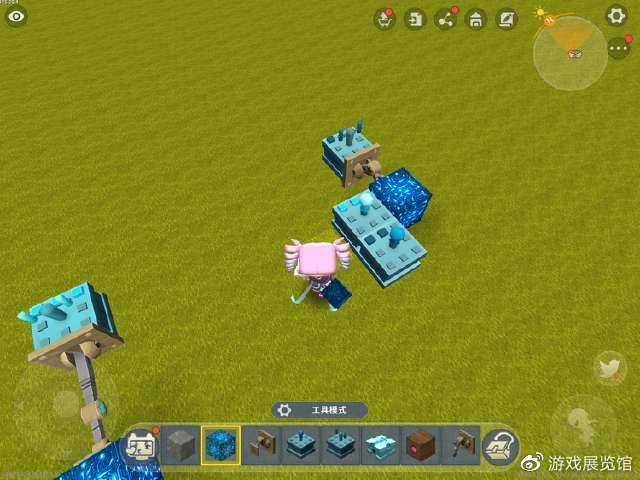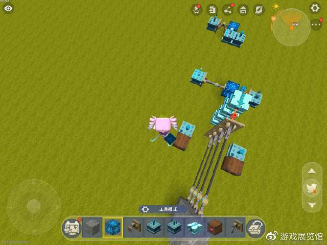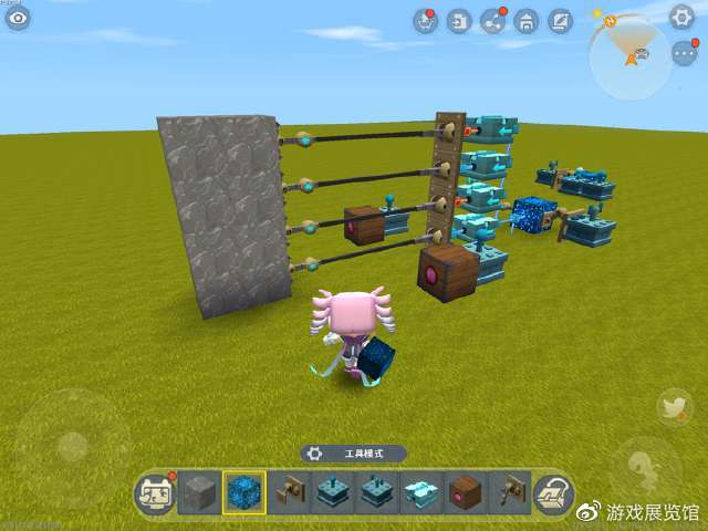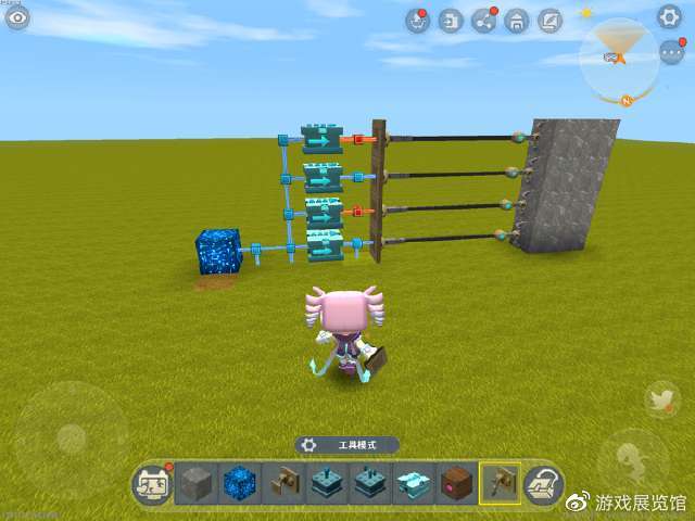 首先,玩家先在地面上放置一列与自己家园围墙等高的同方块作为门框,再在每个方块后方各放下一个机械臂,机械臂的前端对准方块,然后用电能线、信号增强器将它们连接到同一条主线路上,并在其末端放上一个电石块(1号电石块)。