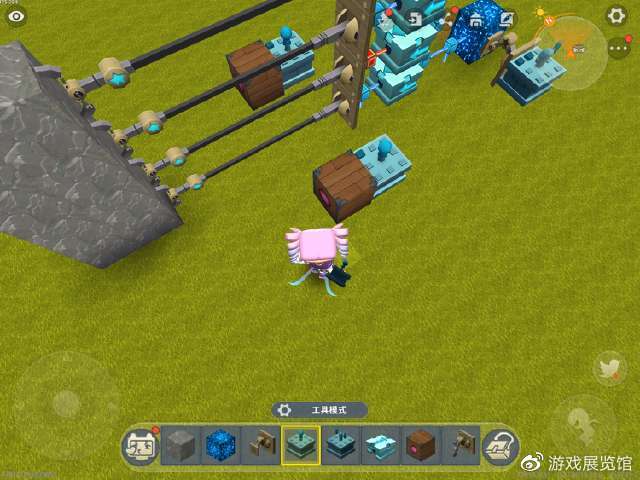 安装好这些机械后,玩家需要将这些机械的电路组合起来,从而让它们产生联动。方法很简单,玩家只需要在信号发生器的范围内放下一个频道为1的信号接收器,再在它前方放置一个抓着电石块(2号电石块)的机械臂。此外,在机械臂的运动轨迹上,玩家还需要依次挨着电石块放下一个频道为3的信号发生器和一个频道为2的信号发生器。