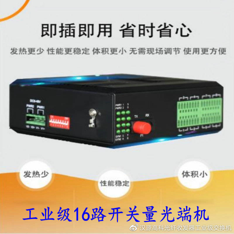 HY5700-16K(Z)是汉源高科的一款工业级16路开关量光端机,设备可以使开关量信号通过光缆在光纤上进行透明传输。全数字实时光传输通道,确保高保真的无损信号传输。面板上有电源指示灯、光信号指示灯、数据信号指示灯,可以直观的检测电源、光信号、数据信号状态。单向系列开关量光端机是高性能,高可靠性的长距离开关量信号光传输系统。