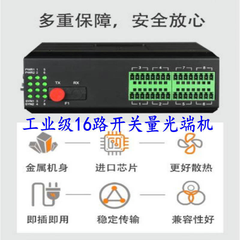 HY5700-16K(Z)工业卡轨式开关量光端机将远端现场的各种串口设备如传感器、变送器、编码器、计数器、变频器、伺服器、执行器、RFID读写终端、模数转换设备、探测器、烟感探头、LED灯光控制、遥控遥测遥信自动化装置、仪器仪表及测量计量设备、IO控制终端、雨刷、加热器、控制报警器、红外补光等设备输入输出的数字IO开关量接口信号通过光纤与中心的计算机、工控机、PLC、POS机、中控系统、数据采集或控制设备、计量计费系统、SCADA(数据采集及监控)、机器视觉及运动控制系统等主机或中央控制系统相连,这样大大方便了中心主机及软件系统同时与多台数字IO开关量设备或装置完成数据通信、采集和控制。支持可控硅、固态继电器、信号继电器及大电流功率继电器等等数字IO开关量输出接口,支持交流、直流触点输出。支持触点负载过流保护,提供自动、手动及遥控过流复位方式。采用先进的高速数字隔离技术,其传输速度和热稳定性远高于普通的光电隔离器;内置15KV静电保护器,可有效防止设备之间由于地不平衡引起的串口损坏及静电击穿。内置的高性能的两级粗细抗雷击保护装置,支持共模和差模两种保护模式。高达10KA通流量的第一级粗保护电路能够有效的降低和抑制雷电、浪涌大信号冲击;第二级精细保护电路能够有效去除小信号残留电压冲击及干扰信号。所有保护电路都采用高可靠、低残压、低寄生电容及快速响应保护时间的防雷器件,因而有效的保护了数字IO开关量通信接口免受雷电及浪涌信号冲击而损坏,并且不会引起信号畸变和传输带宽下降。数字隔离中继器和防雷器的双重保护,使得数字IO开关量通信接口不但免受雷电及浪涌冲击,而且从电气上实现了隔离,因此使得设备的数字IO开关量通信接口得到高可靠保护。