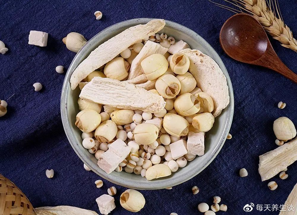 里面所用的四种食材,茯苓,山药,薏米(或芡实),莲子,都是经典的健脾祛湿食材,其中祛湿的是茯苓,化浊的是薏米,养胃健脾的是山药,健脾止泻的是莲子,这些食材可以和排骨,乌鸡,猪肚等搭配炖汤喝。