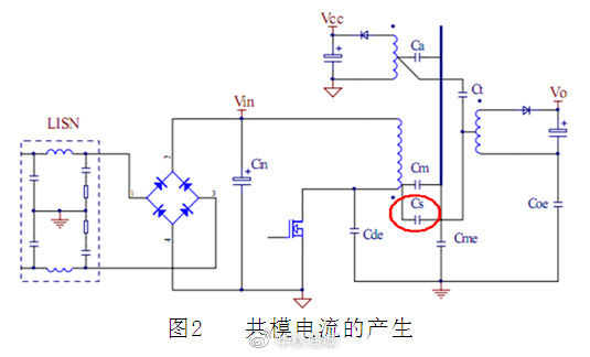3、高频变压器的初级与次级之间存在分布电容Cs,初级的高频电压通过这些分布电容将直接耦合到次级上去,在次级的二条输出直流电源线上产生同相位的共模噪声。如果二条线对地的阻抗不平衡,还会转变成差模噪声。
