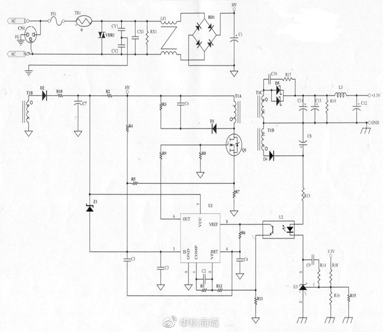 1、 高频变压器初级T1A、开关管Q1和滤波电容C1构成高频开关电流环路,可能会产生