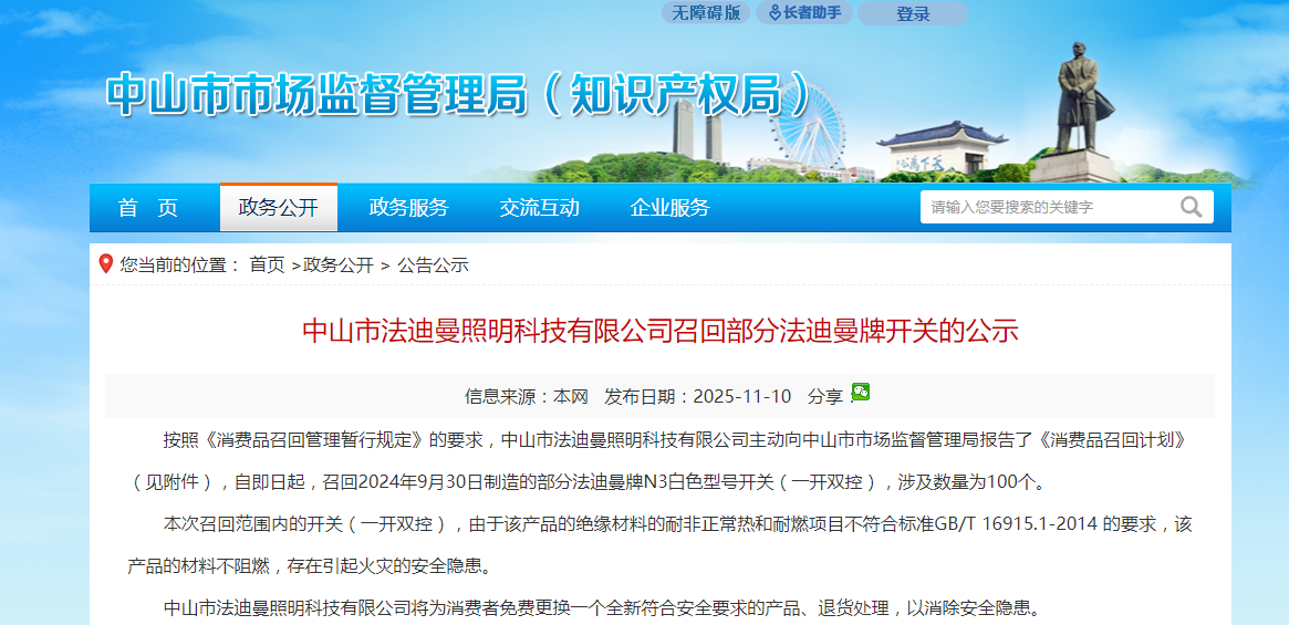 中国质量新闻网讯 据中山市市场监管局网站11月7日消息,按照《消费品召回管理暂行规定》的要求,中山市法迪曼照明科技有限公司主动向中山市市场监督管理局报告了《消费品召回计划》(见附件),自即日起,召回2024年9月30日制造的部分法迪曼牌N3白色型号开关(一开双控),涉及数量为100个。