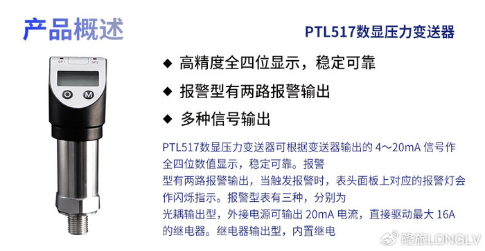 数显压力开关的调试核心是完成通电检查、零点校准、参数设定、输出验证与现场适配,确保压力监测精准、开关动作可靠,适配工业控制逻辑。隆旅PTL517 作为通用工业级电子式数显压力开关,操作逻辑清晰,以下是分步骤调试方法,全程无需表格,按流程操作即可快速落地。