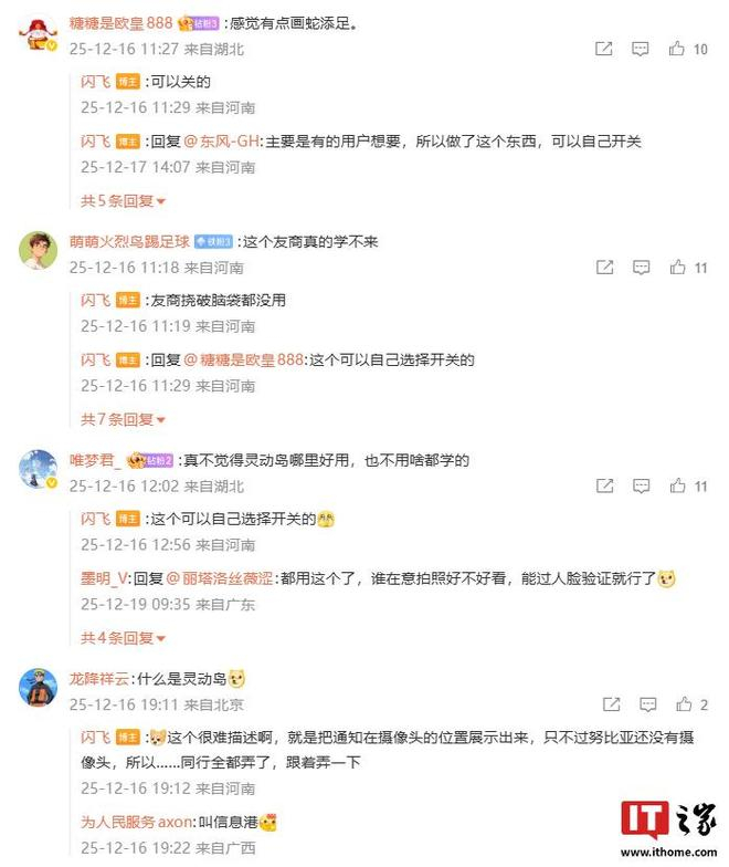 评论区有网友对灵动岛这一设计提出质疑,博主表示:“这个可以自己选择开关的。”