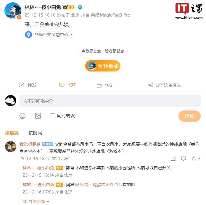 【荣耀 WIN 系列新机全系采用风扇设计,可自己选择开关】荣耀 WIN 系列新机官宣本月登场,IT之家注意到,荣耀中国区智慧生活业务部部长林林昨日与网友互动时透露,WIN 系列新机全系都有风扇,且风扇可以自己开关。林林表示,不会推出无风扇版本。#荣耀WIN#